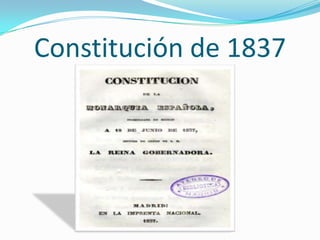 La Constitución de 1837 fue promulgada tras la muerte de Fernando VII. Estableció un régimen monárquico con un parlamento bicameral y sufragio censitario, y garantizó amplias libertades como libertad de prensa. Fue sustituida en 1845 por la Constitución moderada de ese año, que restringió algunas libertades.