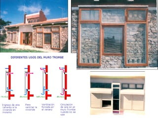 El documento describe estrategias bioclimáticas para el diseño de edificios. Explica la importancia de considerar factores como la orientación, materiales, captación solar, masa térmica e aislamiento para aprovechar la luz y el calor solar en invierno y mantener la frescura en verano. También recomienda el uso de cubiertas y jardines verticales para regular la temperatura y humedad del edificio.