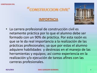 Este documento describe la carrera de Construcción Civil en el Instituto de Educación Tecnológico Público "Enrique López Albujar". La carrera se enfoca en un 90% en la práctica para que los estudiantes adquieran habilidades y experiencia en el uso de herramientas y equipos de construcción. Los objetivos incluyen el desarrollo de técnicas constructivas económicas y compatibles con el medio ambiente. El perfil profesional es un ingeniero en construcción que dirige y asesora el proceso de