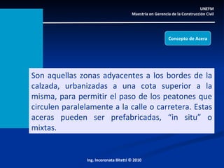 Las aceras son zonas adyacentes a los bordes de la calzada destinadas al paso de peatones. Pueden construirse con hormigón hecho en sitio, adoquines o pastelones prefabricados. Deben tener un ancho mínimo de 1 metro y superficie cómoda y durable según normas municipales. Su construcción requiere preparar el terreno y colocar una sub-base de material granular compactado para obtener los niveles necesarios.