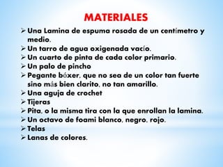 Este documento proporciona instrucciones detalladas para construir títeres de espuma, incluyendo una tortuga, mariposa y gusano. Explica los materiales necesarios y los pasos a seguir para cada figura, como recortar y dar forma a las piezas y unirlas con pegamento. También menciona videos adicionales que muestran cómo completar los títeres. El objetivo es ofrecer una propuesta pedagógica a través de la construcción de títeres tridimensionales con espuma.