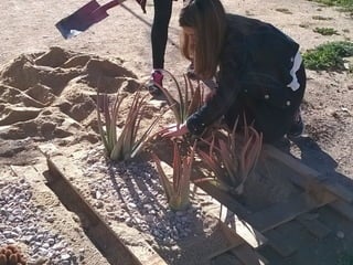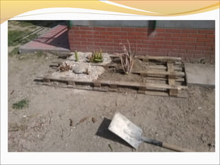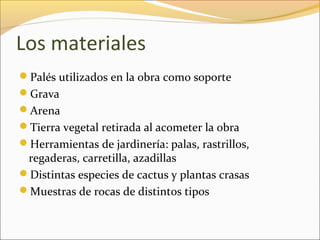 El documento describe el proceso de crear un jardín de cactus y plantas suculentas. Reunieron materiales como palés, grava, arena y tierra, así como varias especies de cactus y plantas crasas. Colocaron los palés, agregaron capas de tierra, plantaron las especies seleccionadas y cubrieron con arena y grava. Finalmente, fotografiaron el jardín y cada elemento para crear un panel explicativo identificando cada parte.