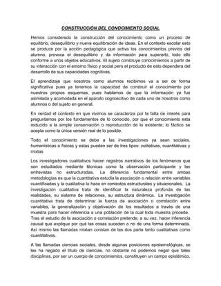 Este documento describe los diferentes métodos de investigación en las ciencias sociales y humanas. Explica que la investigación cualitativa se enfoca en contextos estructurales mediante técnicas como observaciones y entrevistas, mientras que la investigación cuantitativa estudia las asociaciones entre variables cuantificadas. También cubre temas como la construcción del conocimiento social, los diferentes enfoques teóricos de autores como Durkheim y Piaget, y los pasos clave para realizar una investigación científica en este campo como definir un problema, formular hipó
