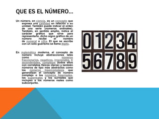 El documento define los diferentes tipos de números, incluyendo números naturales, enteros, racionales, reales y complejos. También describe operaciones básicas como suma, resta, multiplicación y división, así como propiedades fundamentales de los números como la conmutativa, asociativa, distributiva y de identidad. Finalmente, explica las leyes de signos para la suma y multiplicación.