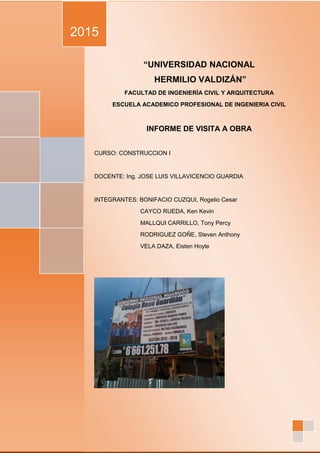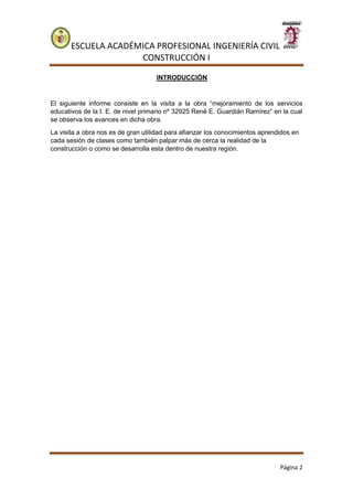 El documento presenta el informe de una visita a la obra de mejoramiento de los servicios educativos de una escuela primaria. Describe los objetivos, la descripción general de la obra, los materiales empleados como ladrillos, acero, cemento, arena y piedra. Explica procesos como el concreto simple, concreto armado, sobrecimientos y columnas. Finalmente, incluye diagramas de flujo de actividades y la distribución general de la obra.