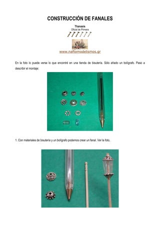 Este documento describe cómo construir fanales utilizando materiales de bisutería como cuentas y bolígrafos. Explica que con estas piezas baratas se pueden crear fanales de diferentes tamaños e incluso otros objetos como luces de posición. El proceso implica ensamblar las piezas de bisutería y bolígrafos para formar las estructuras de los fanales.