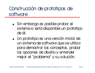 El documento describe dos tipos de prototipos de software: prototipos evolutivos y prototipos desechables. Los prototipos evolutivos se desarrollan de forma incremental y partes del prototipo se incorporan al producto final, mientras que los prototipos desechables se construyen rápidamente para validar requisitos y luego son desechados. Los prototipos ayudan a mejorar la comprensión de los requisitos de los usuarios finales y revelar errores u omisiones en los requisitos iniciales.