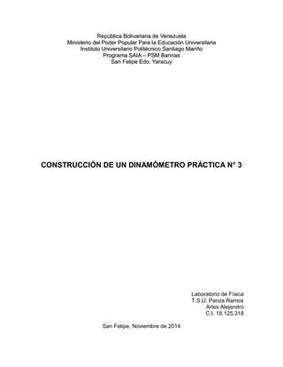 El documento describe el proceso para construir un dinamómetro casero utilizando materiales simples como un martillo, clavo, papel milimetrado y otros elementos. Se destacan los pasos necesarios para realizar la construcción y se discuten las limitaciones de acceso a instrumentos de medición en la actualidad, resaltando la capacidad de invención del ser humano. El dinamómetro, aunque básico, permite medir la fuerza de objetos y ha sido objeto de mejoras a lo largo del tiempo.