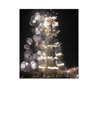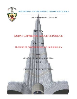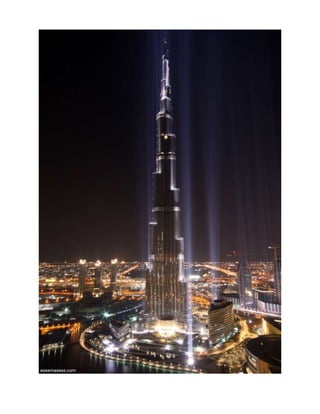 El Burj Khalifa en Dubái es actualmente el edificio más alto del mundo con 828 metros de altura. Su construcción tomó más de 5 años y costó más de $20 mil millones. El diseño se inspiró en una flor nativa y cuenta con elementos arquitectónicos islámicos. Se construyó con 330,000 metros cúbicos de concreto y requirió de 45,000 metros cúbicos sólo para su cimentación, la cual se realizó a más de 50 metros de profundidad.