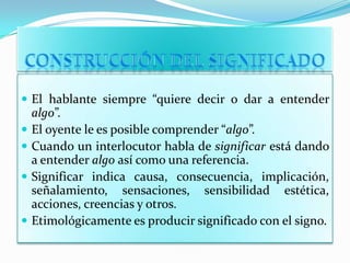 Este documento discute la construcción del significado desde perspectivas lingüísticas, filosóficas y sociológicas. Explica que el significado implica referencias, causas, consecuencias y otras nociones, y que ha sido estudiado por lingüistas, filósofos, psicólogos y sociólogos. Resume tres teorías del significado: referencial, ideacional y comportamental. Finalmente, señala que la significación depende de la convencionalidad de los códigos sociales y la intención comunicativa.