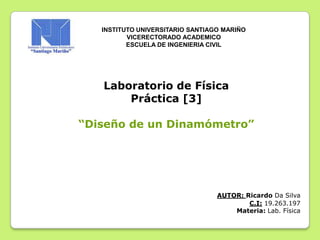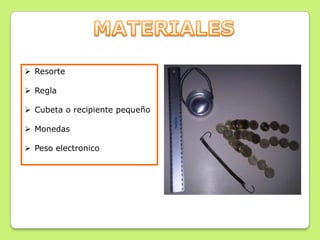 Este documento describe los pasos para diseñar un dinamómetro casero utilizando un resorte y una regla. En el paso 1, se pesan monedas para establecer su relación con la masa. En el paso 2, se arma el dinamómetro colocando un extremo del resorte en un orificio de la regla. En el paso 3, se prueba colocando diferentes masas de monedas en la cubeta, observando la elongación del resorte y su marca en la regla. El dinamómetro permite medir fuerzas aplicando el principio de Isaac