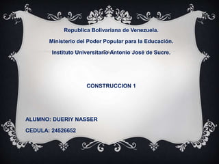 Este documento es un informe de construcción para un estudiante de la Universidad Antonio José de Sucre en Venezuela. Contiene el nombre del estudiante, Duery Nasser, y su número de cédula.