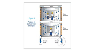 Este documento trata sobre la albañilería confinada y sus componentes estructurales principales. Describe los elementos de la estructura como la cimentación, muros portantes, y techos aligerados de concreto armado. Explica que los muros portantes deben distribuir las cargas de los pisos y las fuerzas sísmicas a través de la estructura, por lo que se requiere una densidad adecuada de muros en ambas direcciones.