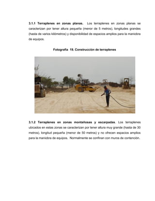 Los terraplenes son grandes acumulaciones de tierra compactada que sirven de soporte para las vías. Existen tres tipos principales: terraplenes en zonas planas, montañosas y onduladas. Su construcción implica extendido del suelo, humectación, compactación, perfilado y conformación de depósitos para materiales sobrantes. El objetivo es lograr la máxima estabilidad y resistencia mecánica mediante la aplicación de energía vibratoria y el control de la humedad del suelo.