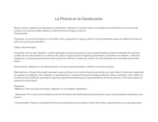 Este documento describe los diferentes tipos y componentes de la pintura. Resume los principales tipos como pintura plástica, esmalte graso, esmalte sintético, pintura al cemento y a la cal. También explica brevemente los componentes clave de la pintura como pigmentos, ligantes, disolventes y aditivos.