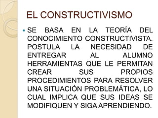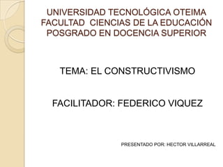 Este documento resume un tema sobre el constructivismo presentado en la Facultad de Ciencias de la Educación de la Universidad Tecnológica Oteima. Se explica que el constructivismo se basa en la teoría del conocimiento constructivista y postula la necesidad de dar al estudiante herramientas para crear sus propios procedimientos para resolver problemas y modificar sus ideas a medida que aprende. También se discute cómo aplicar los principios constructivistas en el aula para lograr aprendizajes significativos en los estudiantes.