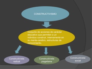 El documento describe tres enfoques del constructivismo: el constructivismo radical, el constructivismo piagetiano y el constructivismo social. El constructivismo radical se basa en el relativismo y que la realidad se construye internamente. El constructivismo piagetiano se enfoca en la interacción personal con el mundo para construir conocimiento. El constructivismo social considera que el conocimiento se construye a través de la interacción con otros en un contexto social.