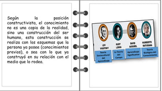 El documento describe las bases del constructivismo como modelo educativo. Sostiene que el conocimiento es una construcción activa del individuo a través de la interacción con su entorno y no una copia pasiva de la realidad. El aprendizaje se da mediante la asimilación y acomodación de nueva información a esquemas cognitivos previos. El rol del estudiante es ser un procesador activo de información, mientras que el docente es un asesor que guía el aprendizaje significativo. La evaluación busca medir el desarrollo de hab