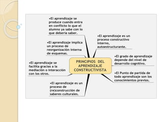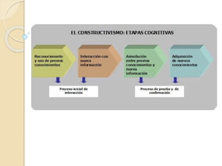 El constructivismo sostiene que el conocimiento no es una copia de la realidad sino una construcción del ser humano basada en sus esquemas previos y su interacción con el entorno. Los estudiantes construyen sus propios aprendizajes a través de la resolución de problemas significativos. Entre los principales contribuyentes al constructivismo se encuentran Piaget, quien estudió el desarrollo cognitivo infantil, Vygotsky y su psicología histórico-cultural, y Ausubel y su énfasis en los conocimientos previos