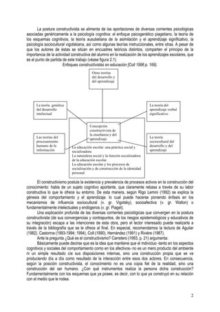 Este documento presenta los principios fundamentales de la perspectiva constructivista del aprendizaje. Explica que desde esta perspectiva, el aprendizaje se entiende como un proceso activo de construcción de significados por parte del estudiante, en el que este reconstruye los saberes culturales a través de la interacción con su entorno y experiencias previas. También destaca que el papel del profesor es guiar este proceso de construcción del conocimiento y enlazarlo con los saberes culturalmente establecidos.