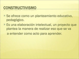 El documento describe la teoría constructivista de la educación. Explica que el constructivismo es una teoría educativa del siglo XX que propone que el conocimiento se construye a través de la experiencia y la interacción. Los estudiantes aprenden analizando activamente lo que perciben a través de sus sentidos y trabajando juntos para explicar los fenómenos. El profesor guía este proceso de construcción del conocimiento de manera holística, involucrando diferentes dimensiones del aprendizaje. El objetivo final es crear una sociedad global donde todas