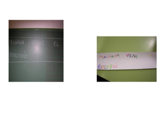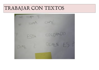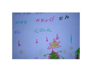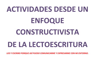 El documento describe diferentes actividades de lectura y escritura desde un enfoque constructivista para varios grados de edad escolar. Las actividades incluyen copiar palabras significativas, escribir el nombre de frutos del otoño, realizar trabajos sobre las características del otoño, ir de excursión y preparar papel, escribir pequeñas historias, poner nombre a dibujos, discriminación auditiva en fichas hechas por los niños, escritura espontánea e inventar historias en el aula, siempre partiendo de los intereses de los