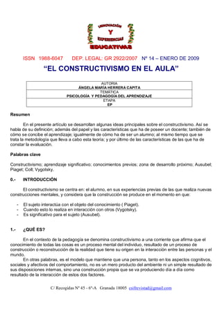 El documento resume las ideas principales del constructivismo como teoría del aprendizaje, incluyendo que el conocimiento se construye a partir de las experiencias y conocimientos previos del estudiante, que el aprendizaje es un proceso activo de construcción de significados, y que factores como la motivación y disposición del estudiante afectan el tipo de aprendizaje que ocurre.