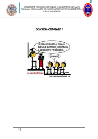 El documento trata sobre la teoría del constructivismo. Explica que el constructivismo sostiene que el conocimiento es construido activamente por el individuo a través de la experiencia y no es pasivamente recibido. Luego resume los principales representantes de esta teoría como Piaget, Ausubel y Vygotsky. Finalmente, enumera varios principios del enfoque constructivista en la educación como que el aprendizaje depende de los conocimientos y experiencias previas del estudiante y que debe ser significativo para él.