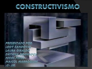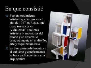 El constructivismo surgió en Rusia en 1917 como un movimiento artístico basado en el cubismo que promovió una estética asociada a la producción industrial. Artistas como Tatlin, Malevich, Rodchenko, Kandinsky, Gabo y Lissitzky crearon composiciones geométricas abstractas inspiradas en la ingeniería y aplicaron el estilo al diseño, carteles, moda y arquitectura. Se caracterizó por el uso de formas planas, líneas y colores primarios en obras tridimensionales que reflejaban la técn