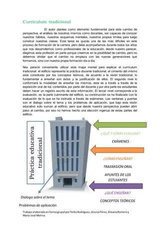 El documento resume las ideas de Rafael Porlán sobre un modelo de enseñanza-aprendizaje basado en la investigación. Porlán propone romper con la disociación entre teoría y práctica en la enseñanza. El currículo debe basarse en los problemas prácticos, las creencias de los docentes y los aportes de las ciencias de la educación. Porlán critica el currículo tradicional basado en la transmisión de contenidos y propone que los docentes analicen sus propias prácticas para impulsar cambios en la