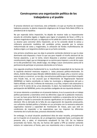Este documento propone la construcción de una organización política de los trabajadores y el pueblo en México. Argumenta que el proceso electoral reciente mostró la voluntad de la clase dominante de imponer a su candidato a cualquier costo, y la incapacidad de las fuerzas de izquierda para impedir el fraude. También señala la falta de un trabajo organizado con las masas que las haga menos susceptibles a la manipulación. Finalmente, propone la creación de una coordinación general de militantes revolucionarios para dirigir la lucha contra la imposición de