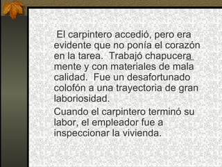 Un carpintero que planeaba jubilarse accedió a construir una casa más como un favor especial para su contratista, pero la construyó de manera chapucera. Cuando terminó, el contratista le reveló que la casa era un regalo para él como muestra de aprecio por sus años de servicio, haciendo que el carpintero se sintiera avergonzado por no haber puesto más esfuerzo en su construcción.