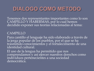El documento resume las teorías de Campillo y Habermas sobre el lenguaje y la comunicación. Campillo ve el lenguaje como un elemento fundamental para la transmisión cultural y la identidad, así como para ejercer los derechos democráticos. Habermas argumenta que una comunicación efectiva requiere ser comprensible, promover la construcción de juicios claros y enriquecer el diálogo. Ambos filósofos enfatizan la importancia del lenguaje y el diálogo para la democracia y la sociedad.