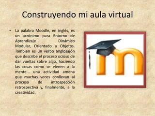 Este documento presenta una introducción a Moodle, un software de gestión de aprendizaje abierto que permite crear aulas virtuales. Explica que Moodle facilita la creación de espacios virtuales con recursos educativos como textos, imágenes, audio, video y tareas. También permite que profesores diseñen y entreguen contenido a estudiantes y que evalúen trabajos y exámenes de manera virtual. El objetivo final es apoyar procesos de enseñanza y aprendizaje a distancia de manera dinámica y flexible