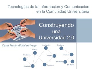 El documento describe cómo las universidades pueden adoptar un enfoque de "Universidad 2.0" mediante el uso de tecnologías de la información y la comunicación (TIC) para impartir cursos. Explica que las clases pueden impartirse de forma presencial, en línea o híbrida, y que las comunidades virtuales pueden apoyar el aprendizaje. Además, identifica cuatro etapas clave para la inclusión progresiva de las TIC en la universidad, desde el uso de herramientas digitales en el aula hasta la