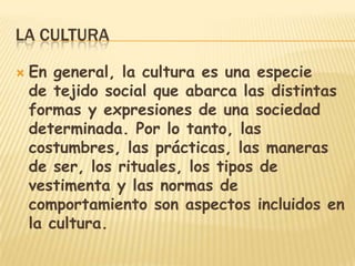 La cultura incluye las costumbres, prácticas y normas de una sociedad. Un emprendedor es alguien dispuesto a asumir riesgos para identificar oportunidades de negocio y organizar los recursos necesarios para aprovecharlas. El emprendimiento siempre ha estado presente en la historia humana, pero se ha vuelto más importante recientemente para superar problemas económicos a través de la identificación y explotación de oportunidades.