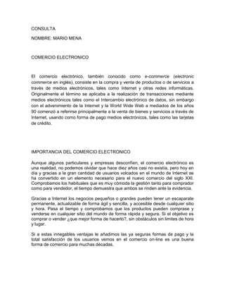 El documento habla sobre el comercio electrónico. Explica que consiste en la compra y venta de productos o servicios a través de Internet y redes informáticas usando medios de pago electrónicos como tarjetas de crédito. Detalla la importancia del comercio electrónico para negocios pequeños y grandes al ofrecer un escaparate accesible las 24 horas desde cualquier lugar. Finalmente, describe cuatro categorías del comercio electrónico: empresa-empresa, empresa-consumidor, empresa-administración y consumidor-administración.