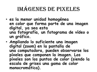 Este documento describe las diferencias entre imágenes de pixeles e imágenes vectoriales. Explica que las imágenes de pixeles están compuestas por la unidad más pequeña de color llamada píxeles, mientras que las imágenes vectoriales están formadas por objetos geométricos independientes definidos por atributos matemáticos. También señala que las imágenes vectoriales pueden ampliarse sin pérdida de calidad y son más fáciles de modificar en comparación con las imágenes de pixeles.