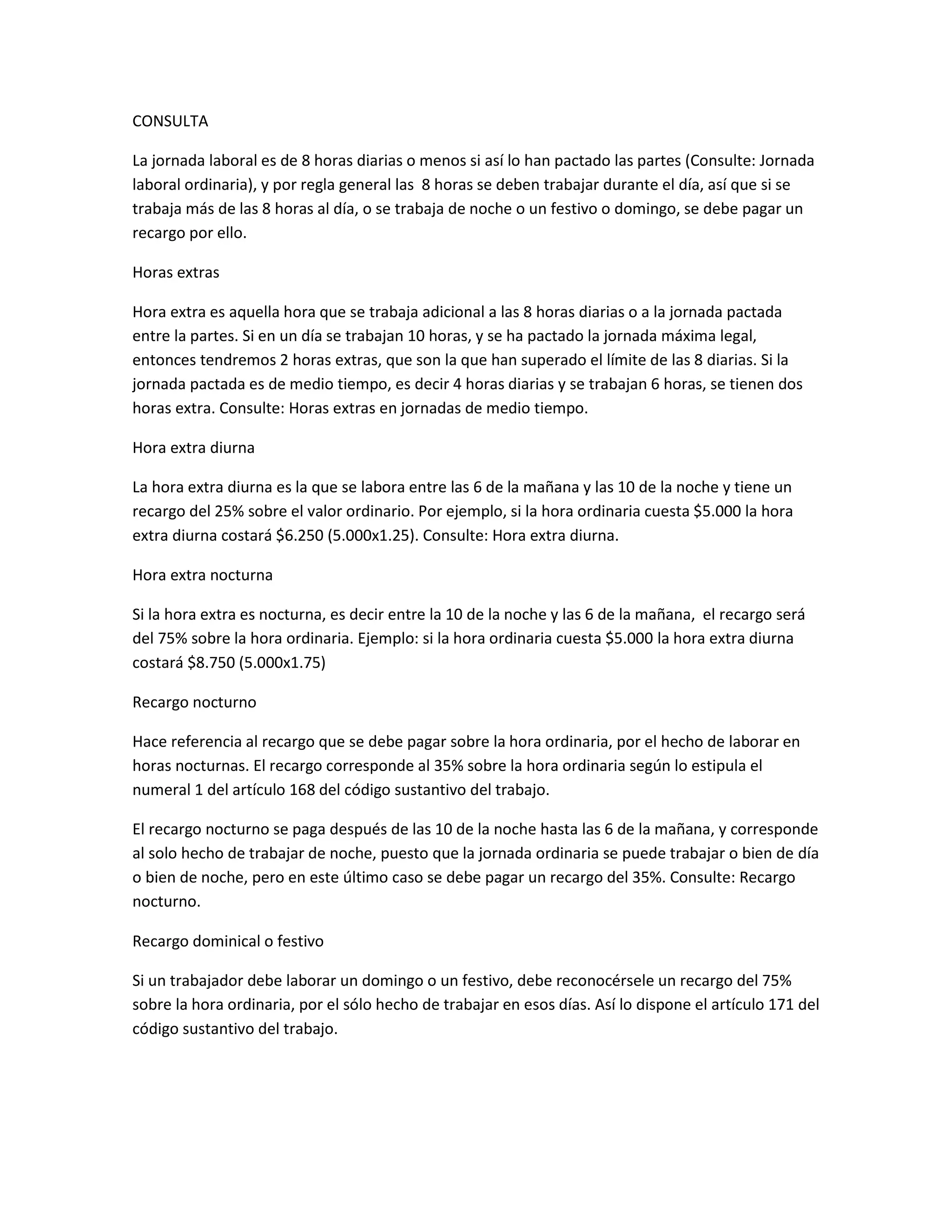 La jornada laboral ordinaria es de 8 horas diarias. Si se trabaja más de 8 horas, o de noche, en festivos o domingos, se debe pagar un recargo. Existen recargos para horas extras diurnas (25%), horas extras nocturnas (75%), trabajo nocturno (35%), y trabajo los domingos o festivos (75%). Estos recargos se pueden combinar, por ejemplo horas extras diurnas dominicales tienen un recargo del 100% (75% por ser domingo + 25% por ser hora extra diurna).