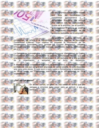 Este documento proporciona definiciones y explicaciones sobre conceptos básicos de contabilidad y finanzas como contabilidad, gastos, ingresos, aportes de capital, documentos comerciales y los tipos más utilizados como facturas, recibos, pagarés, notas de débito, notas de crédito y cheques.