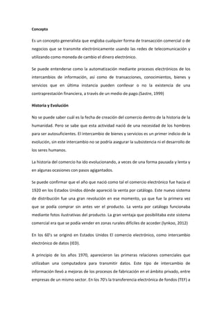 Este documento trata sobre el concepto y la historia del comercio electrónico. Explica que el comercio electrónico involucra cualquier transacción comercial que se realiza electrónicamente a través de redes de telecomunicación. Luego describe que la historia del comercio electrónico comenzó en la década de 1920 con la venta por catálogo en los Estados Unidos y evolucionó con el desarrollo de las computadoras y Internet, llevando al surgimiento del comercio en línea en la actualidad.