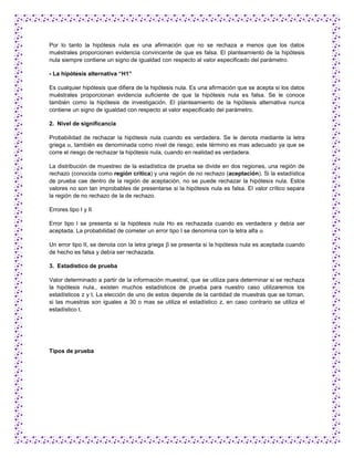 Este documento discute los conceptos clave de las pruebas de hipótesis, incluyendo: 1) la hipótesis nula y alternativa, 2) el nivel de significancia, y 3) el estadístico de prueba. También cubre cómo formular la regla de decisión y tomar una decisión final sobre si rechazar o no la hipótesis nula. El objetivo general es explicar los pasos involucrados en realizar una prueba de hipótesis estadística.
