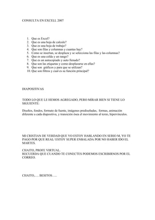 Este documento proporciona una lista de 10 preguntas sobre funciones básicas de Excel como hojas de cálculo, filas, columnas, celdas, rangos, autocopiado, etiquetas y gráficos. También pregunta sobre filtros y su función principal. El segundo párrafo habla sobre elementos que deben incluirse en diapositivas de PowerPoint como diseños, fondos, formato de fuente, imágenes, formas, animación y transiciones. Los últimos párrafos son mensajes personales que no son relevantes para el resumen.