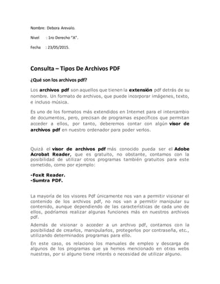 Los archivos PDF son archivos que tienen la extensión .pdf, permiten incorporar imágenes, texto y música. Son uno de los formatos más usados para intercambiar documentos en Internet pero requieren de programas como Adobe Acrobat Reader para verlos. Los archivos PDF pueden ser creados, manipulados y protegidos con contraseña usando programas especializados.