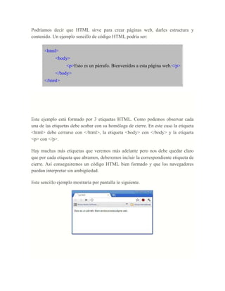 Access es un programa que permite crear y administrar bases de datos donde se puede guardar información relacionada con un tema específico. Microsoft Access tiene funciones que facilitan la manipulación y modificación de la información en la base de datos. HTML es el lenguaje usado para crear páginas web y darles estructura y contenido mediante el uso de etiquetas.