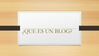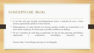 Un blog es un sitio web que recopila artículos de uno o más autores de forma cronológica, permitiendo que los lectores comenten y el autor responda, lo que facilita el diálogo. Los blogs pueden tratar sobre temas personales, periodísticos, empresariales, tecnológicos u otros, y sirven como herramientas para publicar y compartir información actualizada a través de texto, imágenes, video y audio.