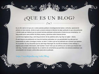 Un blog es un sitio web en el que uno o más autores publican artículos de forma cronológica. Los blogs permiten a los lectores comentar y participar, y suelen tener una temática específica como personal, corporativo o educativo. Los blogs sirven para compartir ideas y opiniones de manera libre.