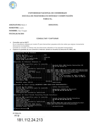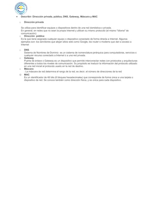 NAT es un mecanismo utilizado por routers IP para intercambiar paquetes entre redes con direcciones incompatibles mediante la conversión dinámica de direcciones. Una captura de pantalla muestra una conexión a Internet con la dirección IP pública, MAC y otros detalles. Las direcciones privadas identifican dispositivos dentro de una red privada, mientras que las públicas identifican dispositivos conectados directamente a Internet. El DNS es el sistema de nombres de dominio para recursos en Internet o redes privadas. El gateway permite interconectar redes con protocolos
