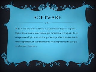 El documento define varios términos relacionados con software, hardware y el funcionamiento de Internet. Explica que el software son los componentes lógicos de un sistema, mientras que el hardware son los componentes físicos. Define HTML como el lenguaje de marcado para páginas web, hosting como el servicio de alojamiento web, y TCP como el protocolo de transferencia de archivos. También define servidor, sitio web, dominio e hipertexto.