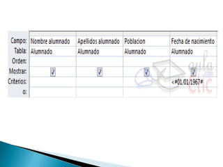 3) Para crear una consulta se seleccionan las tablas, luego los campos en la cuadrícula QBE, y se pueden agregar criterios para filtrar los resultados.